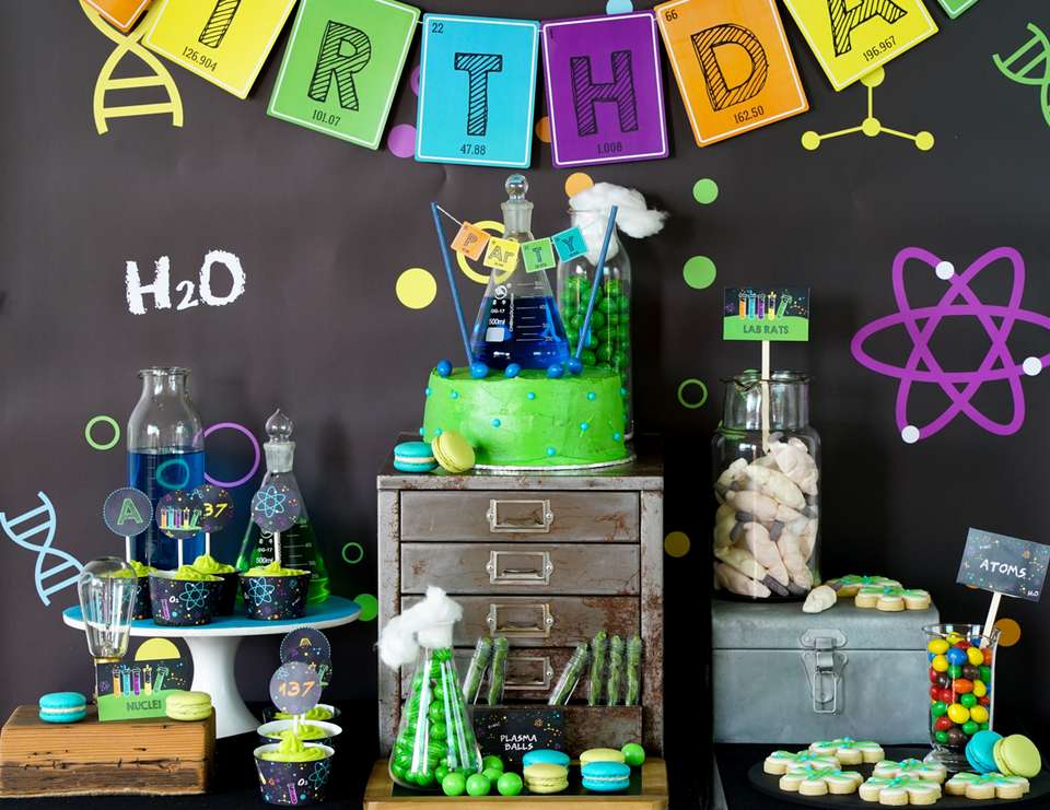 There are so many options for DIY fun with a wild science party, but don't forget the costumes with some little lab coats and nerdy glasses. You can make fun name tags named after real world scientist puns and make yummy white chocolate or marshmallow lab rats.