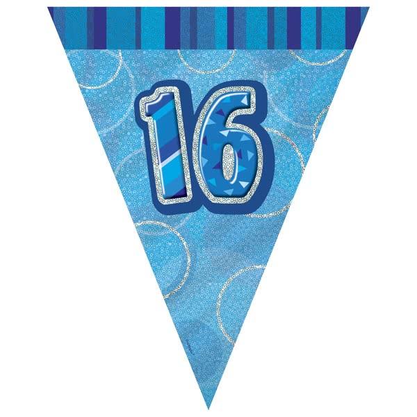 Blue Glitz 16th Flag Banner 3.65M. Banner is 3.6 metres long with 12 foil flags each measuring 27cm in length.
